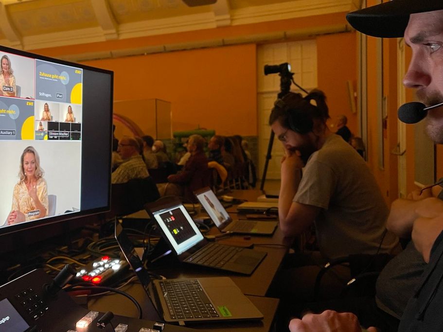 Hybride Events sind eine Mischung aus virtuellem Event und Live-Event. Dabei können bestimmte Teilnehmer vor Ort geladen werden und weitere Teilnehmer sich auf unterschiedliche Art und Weise online zur Übertragung dazuschalten.
